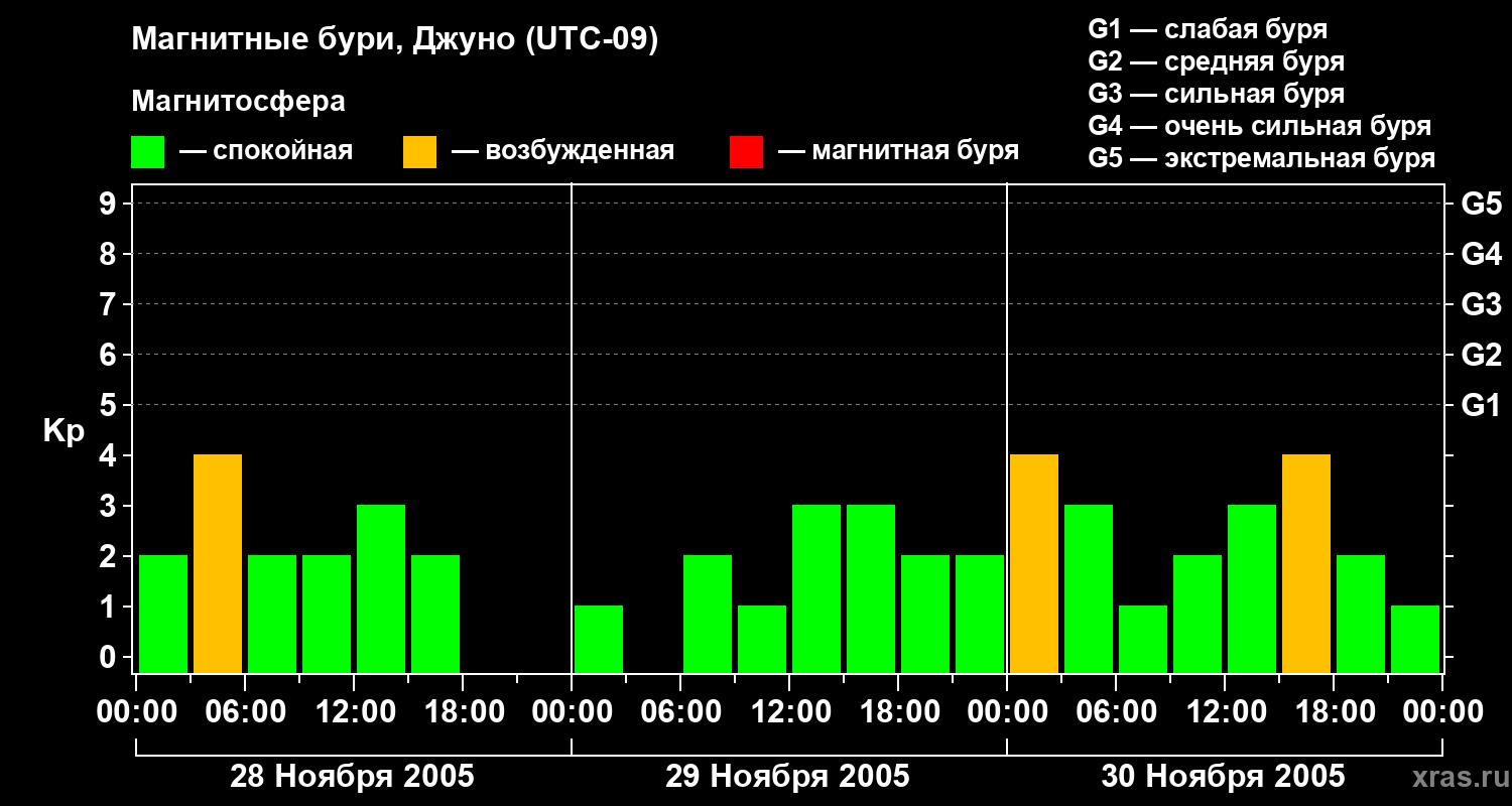 Изменения геомагнитного индекса Kp с 28 по 30 ноября 2005 года для средних широт