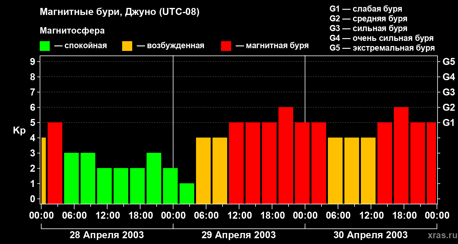 Изменения геомагнитного индекса Kp с 28 по 30 апреля 2003 года для средних широт