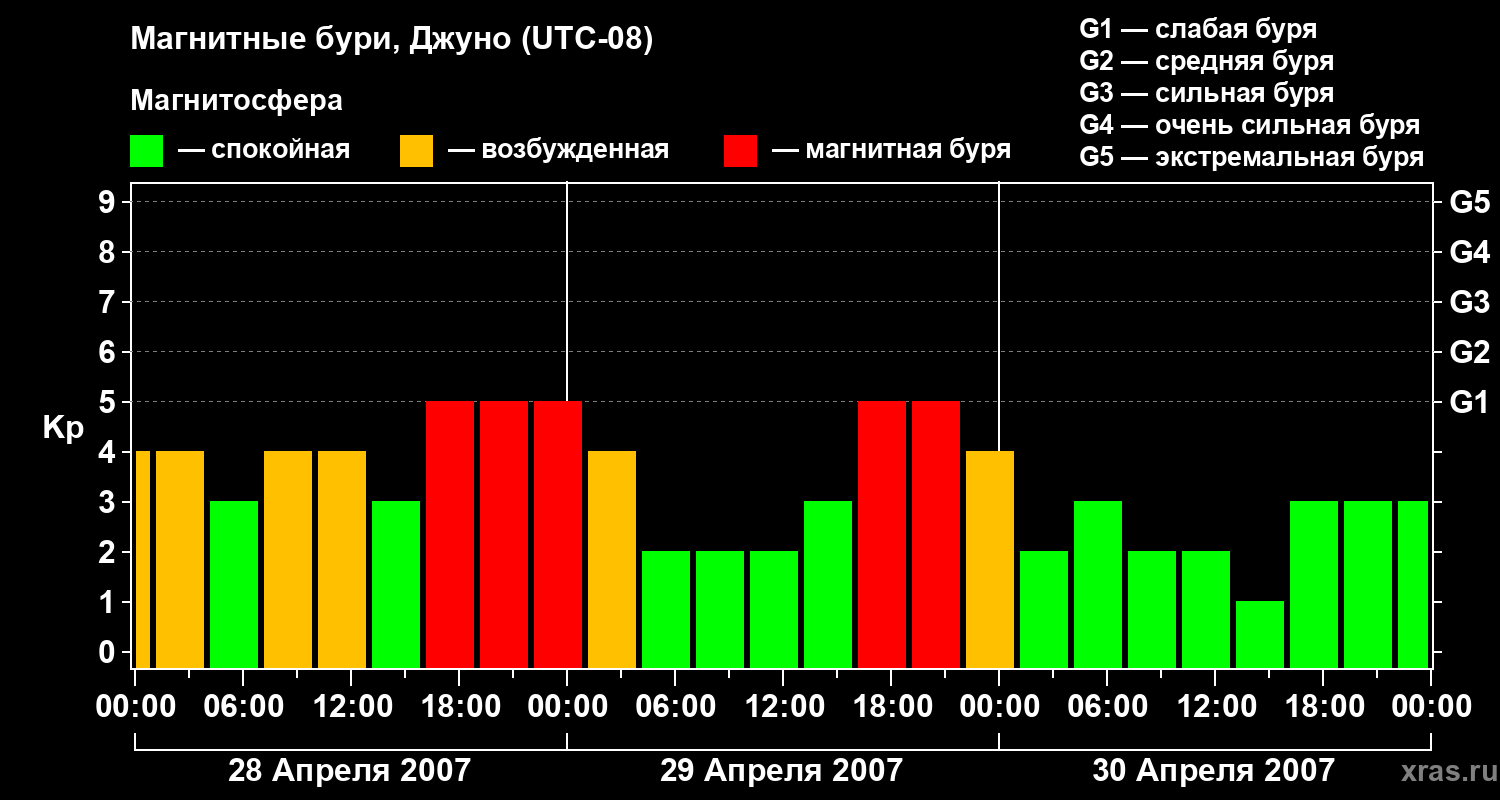 Изменения геомагнитного индекса Kp с 28 по 30 апреля 2007 года для средних широт