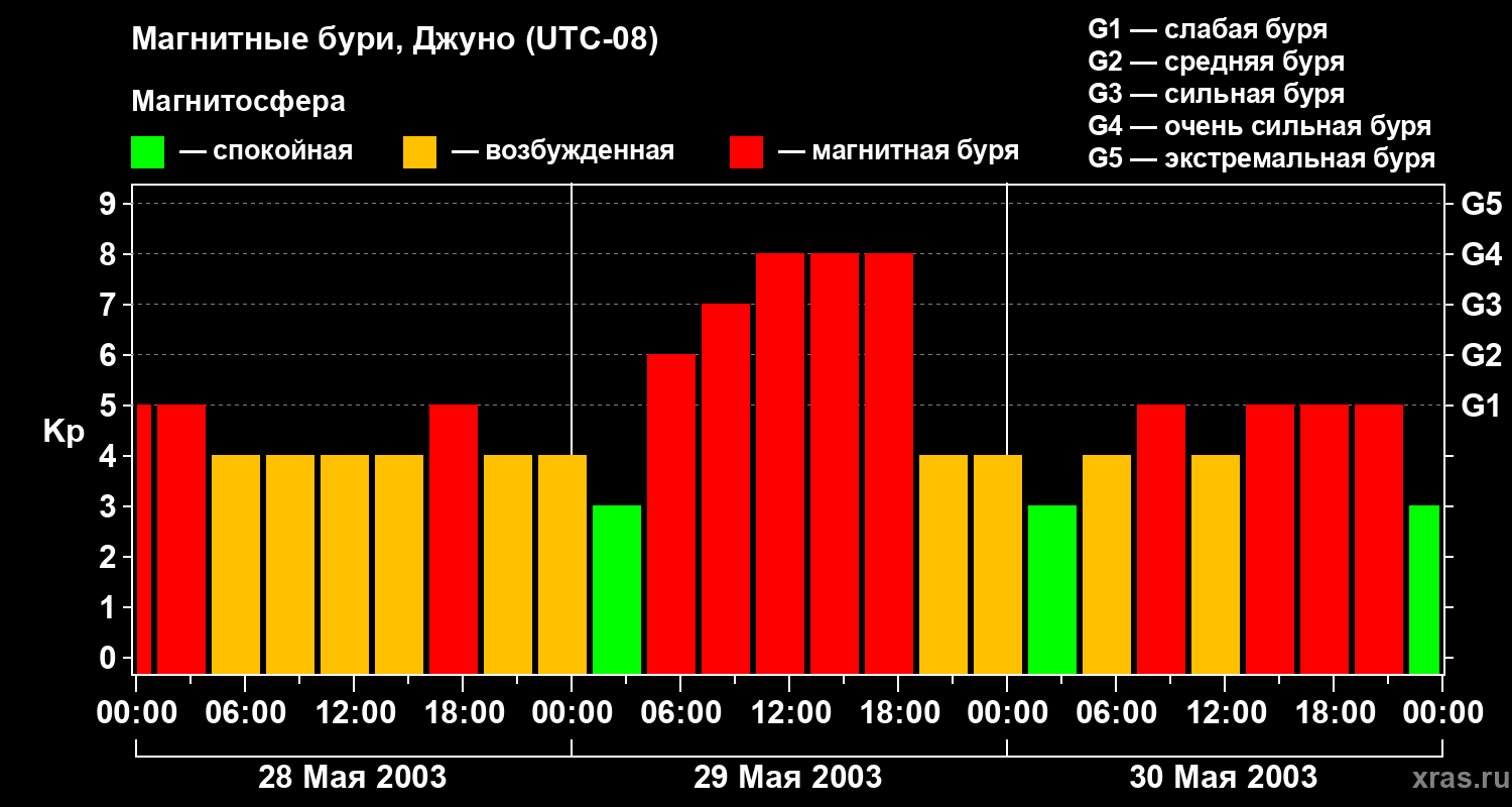 Изменения геомагнитного индекса Kp с 28 по 30 мая 2003 года для средних широт