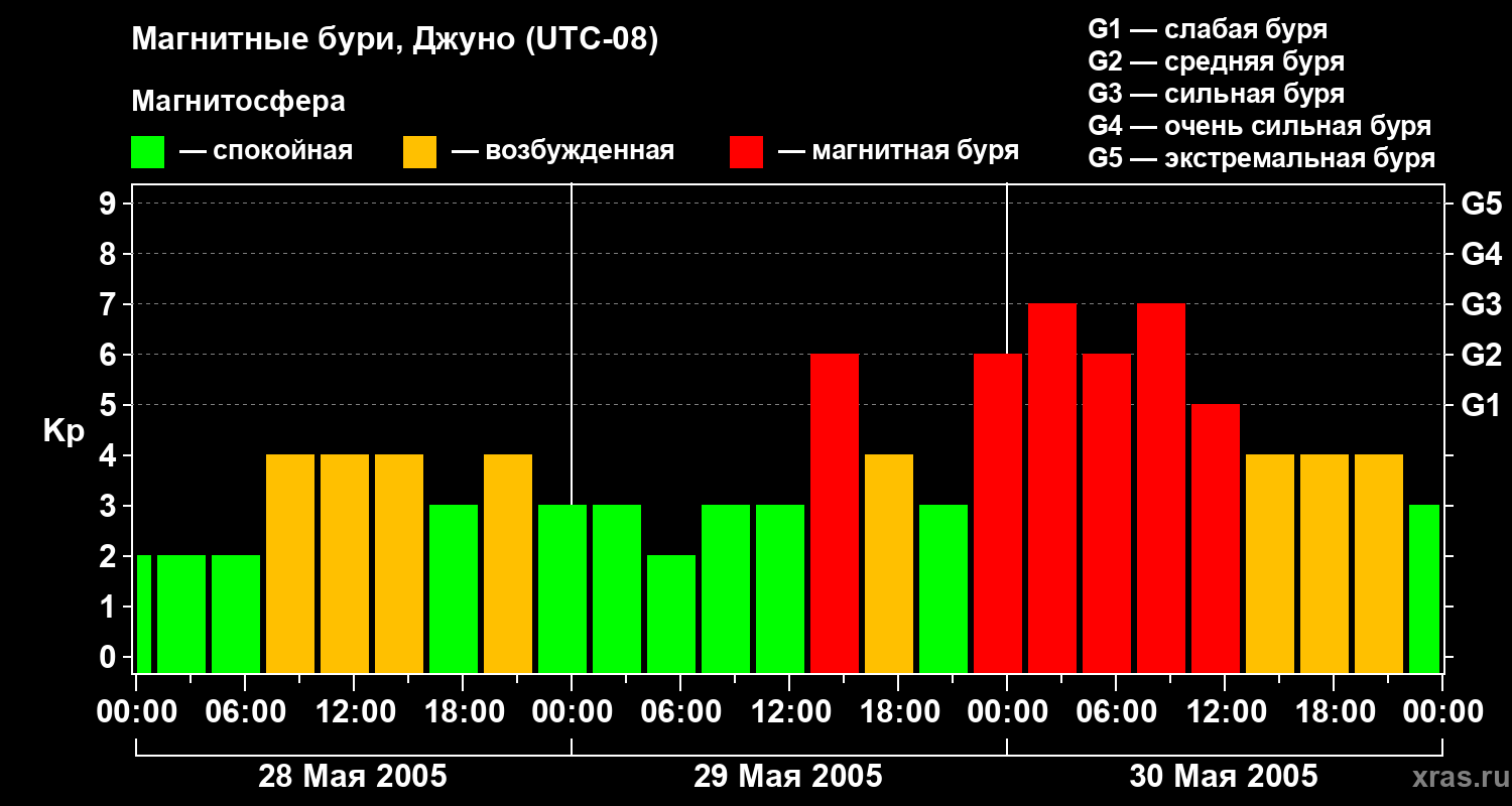 Изменения геомагнитного индекса Kp с 28 по 30 мая 2005 года для средних широт