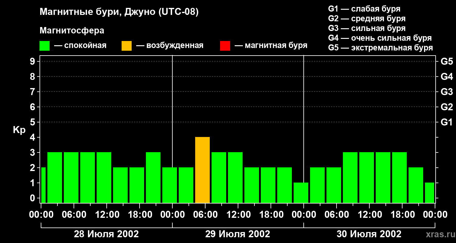 Изменения геомагнитного индекса Kp с 28 по 30 июля 2002 года для средних широт