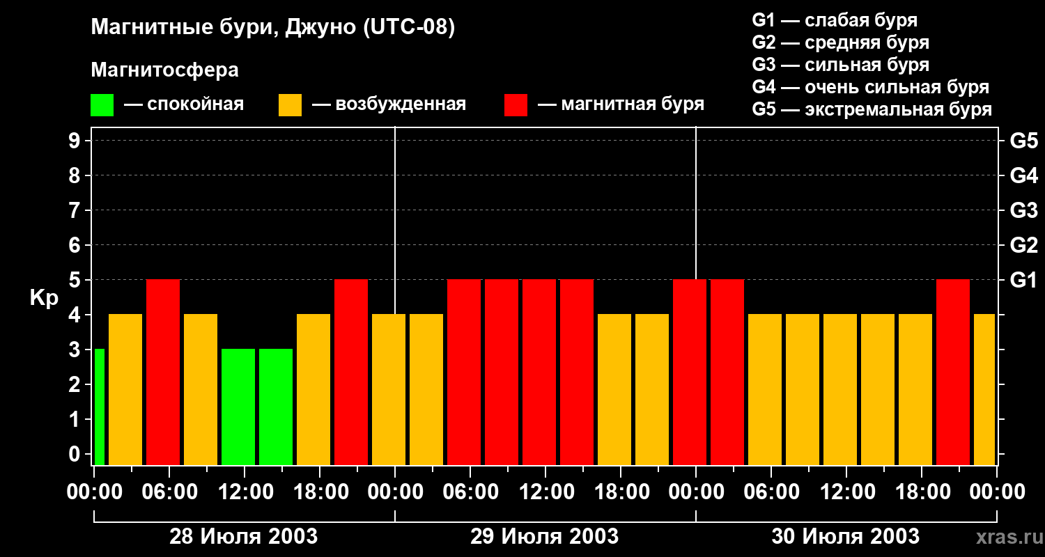 Изменения геомагнитного индекса Kp с 28 по 30 июля 2003 года для средних широт