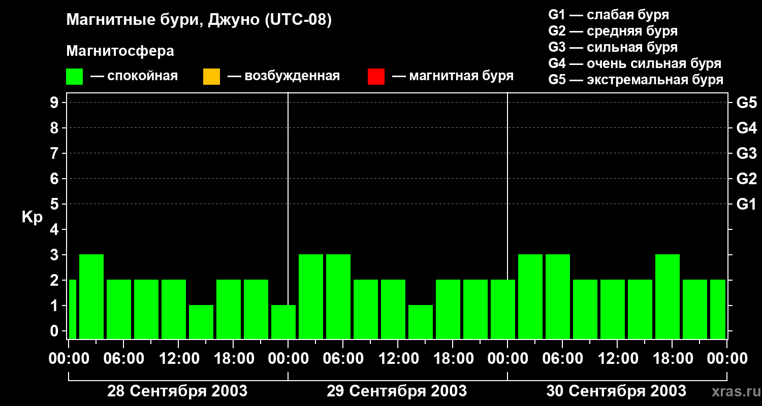 Изменения геомагнитного индекса Kp с 28 по 30 сентября 2003 года для средних широт