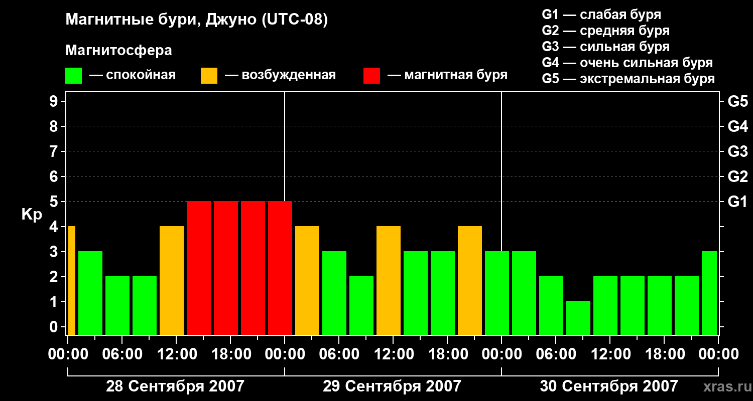 Изменения геомагнитного индекса Kp с 28 по 30 сентября 2007 года для средних широт