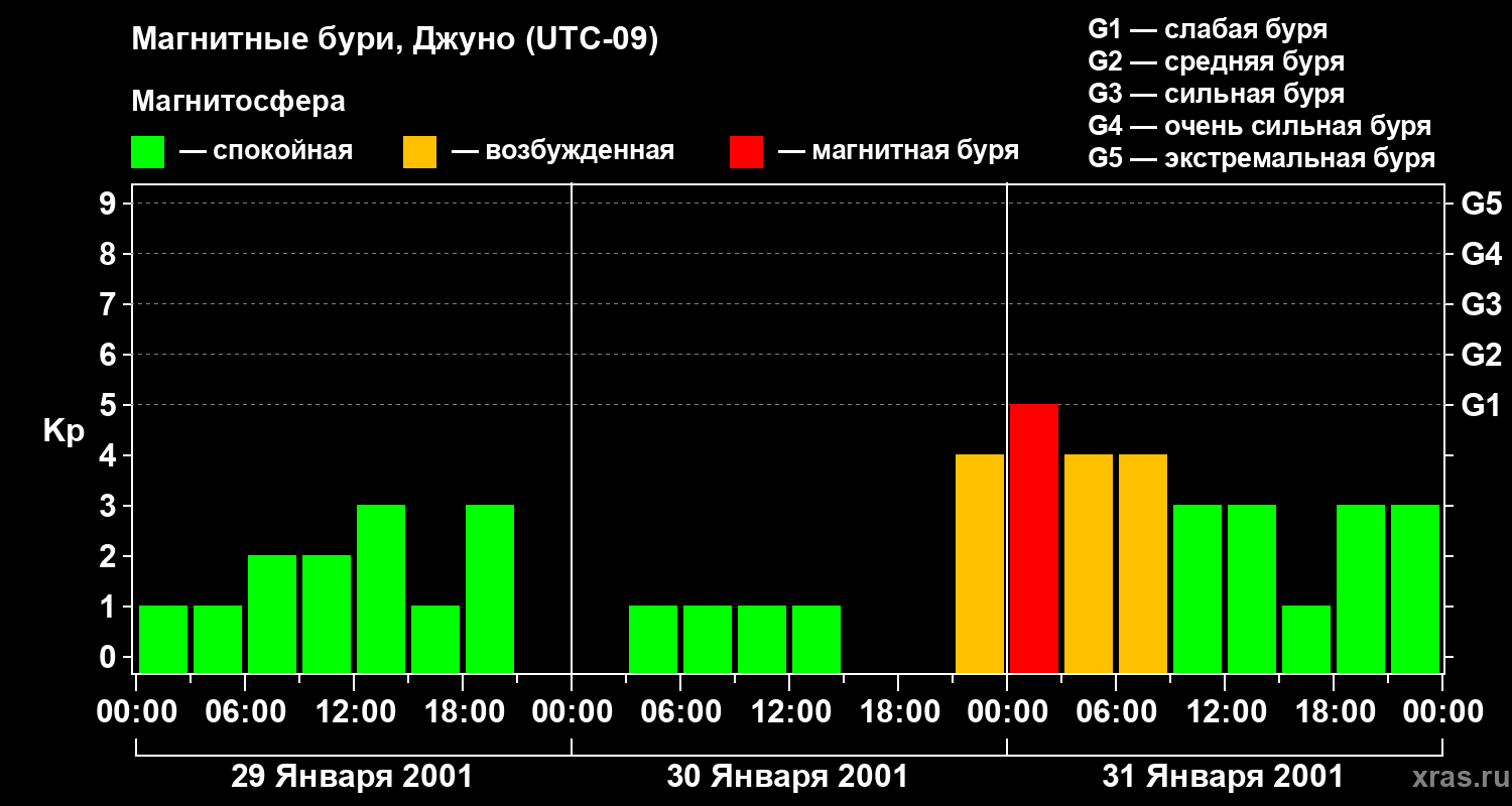 Изменения геомагнитного индекса Kp с 29 по 31 января 2001 года для средних широт