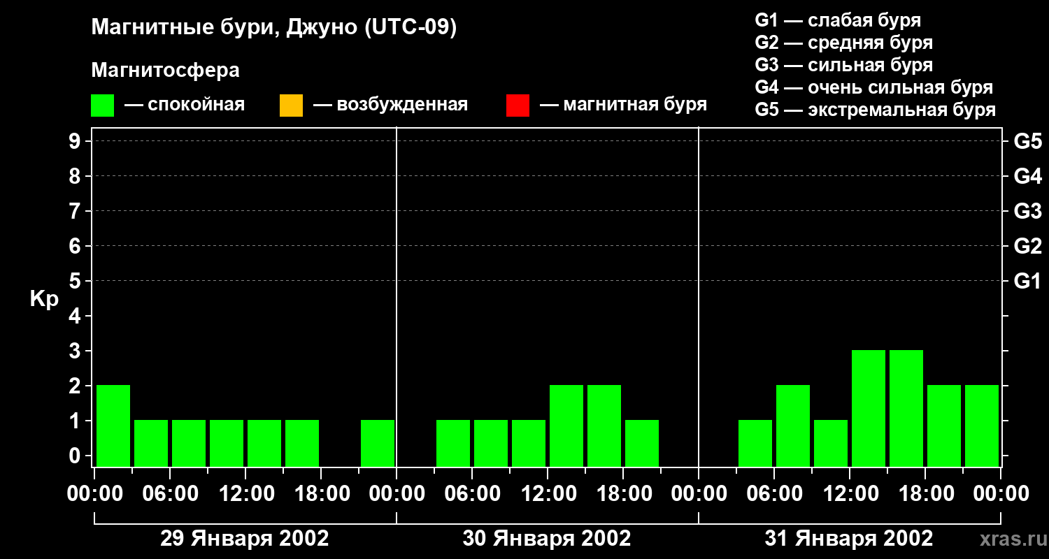 Изменения геомагнитного индекса Kp с 29 по 31 января 2002 года для средних широт