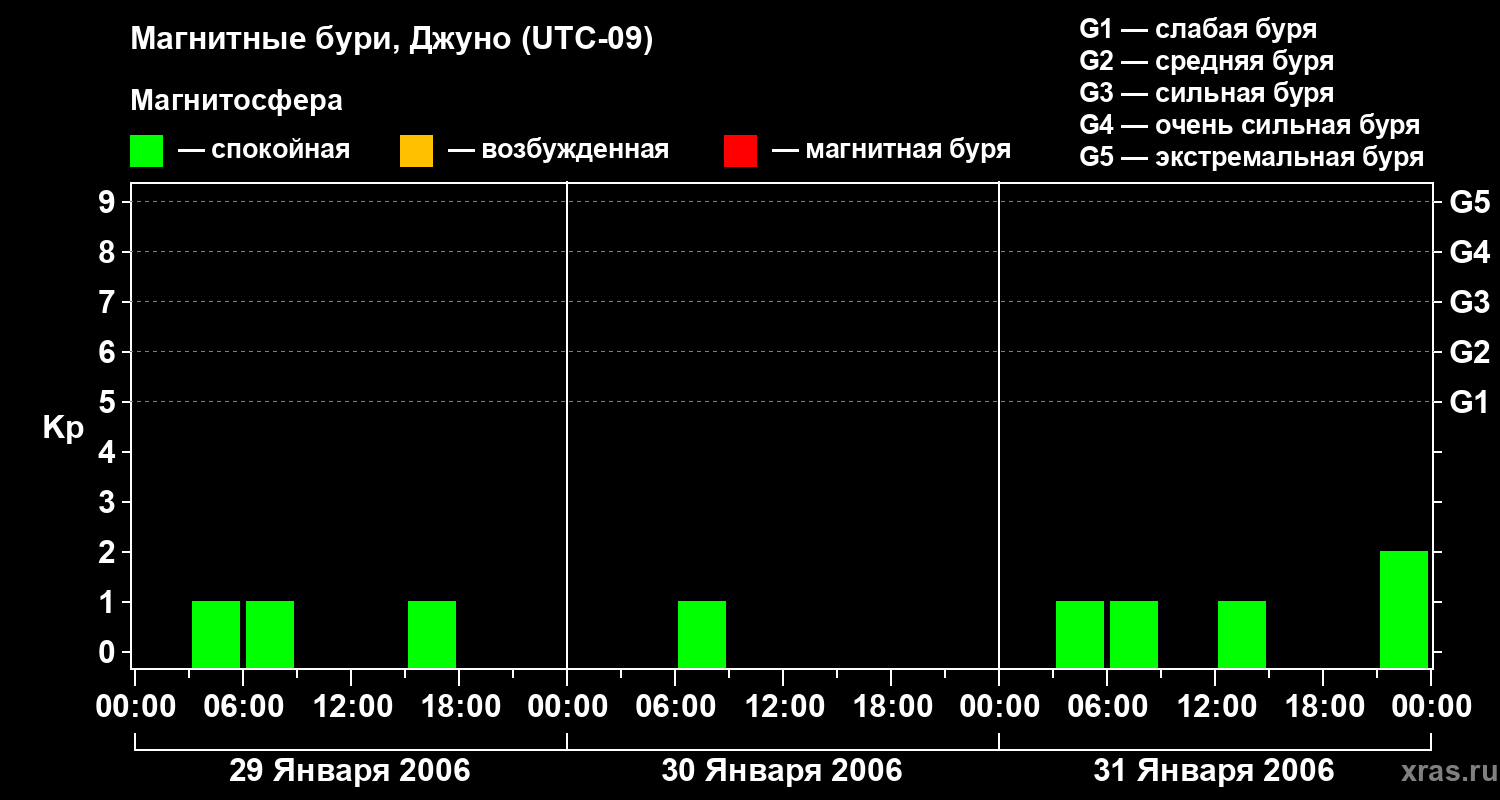 Изменения геомагнитного индекса Kp с 29 по 31 января 2006 года для средних широт