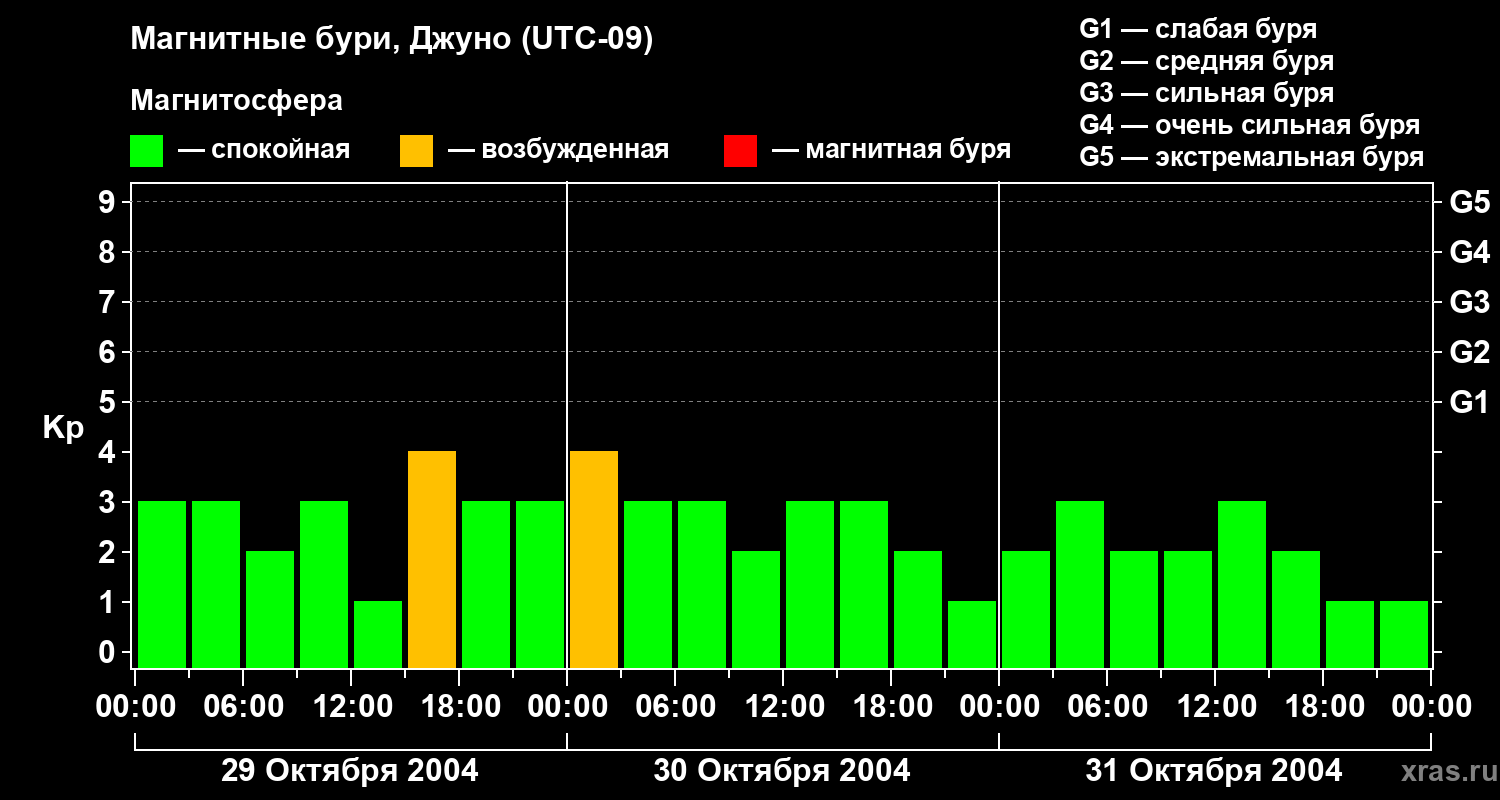 Изменения геомагнитного индекса Kp с 29 по 31 октября 2004 года для средних широт