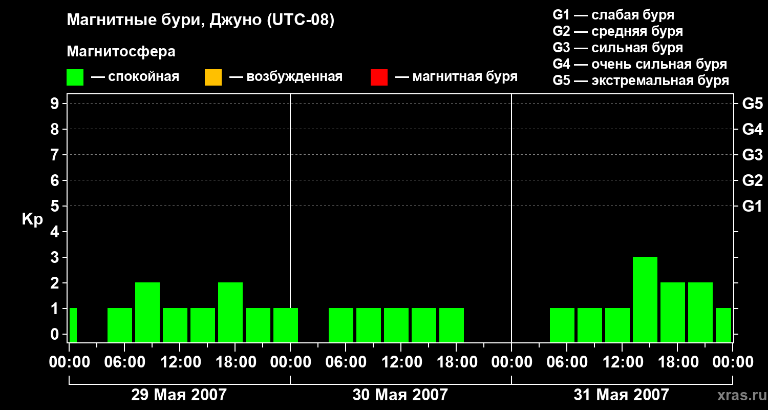 Изменения геомагнитного индекса Kp с 29 по 31 мая 2007 года для средних широт
