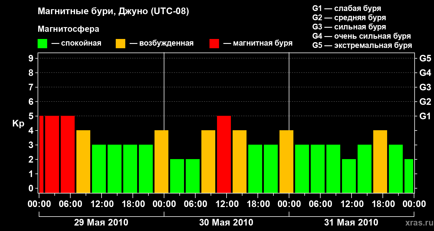 Изменения геомагнитного индекса Kp с 29 по 31 мая 2010 года для средних широт