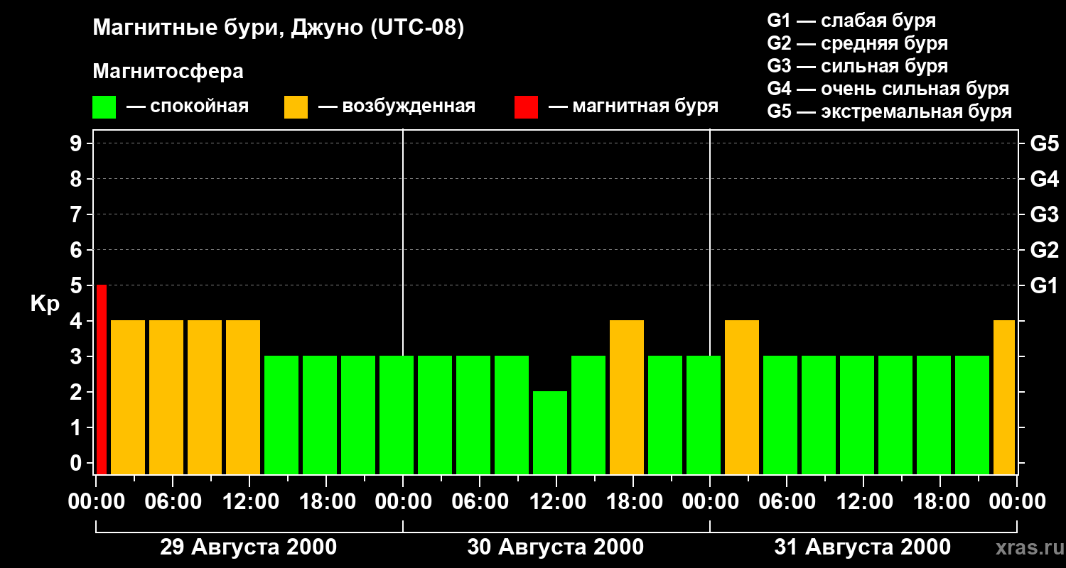 Изменения геомагнитного индекса Kp с 29 по 31 августа 2000 года для средних широт