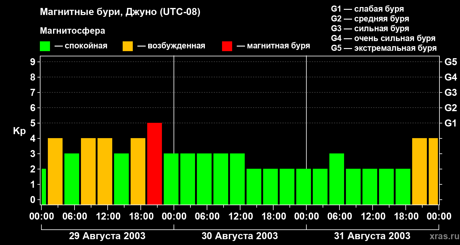 Изменения геомагнитного индекса Kp с 29 по 31 августа 2003 года для средних широт