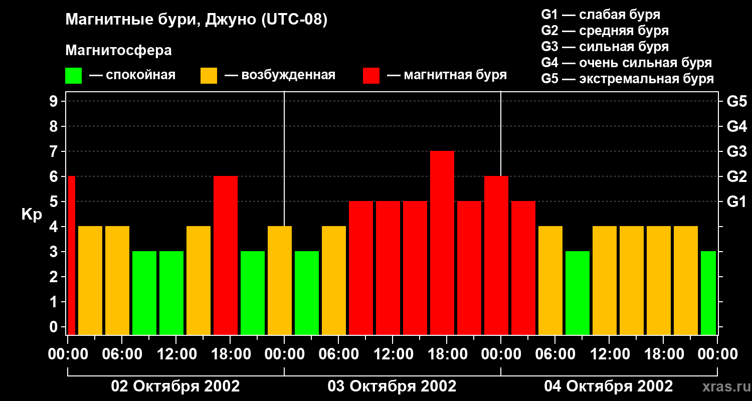 Изменения геомагнитного индекса Kp с 2 по 4 октября 2002 года для средних широт