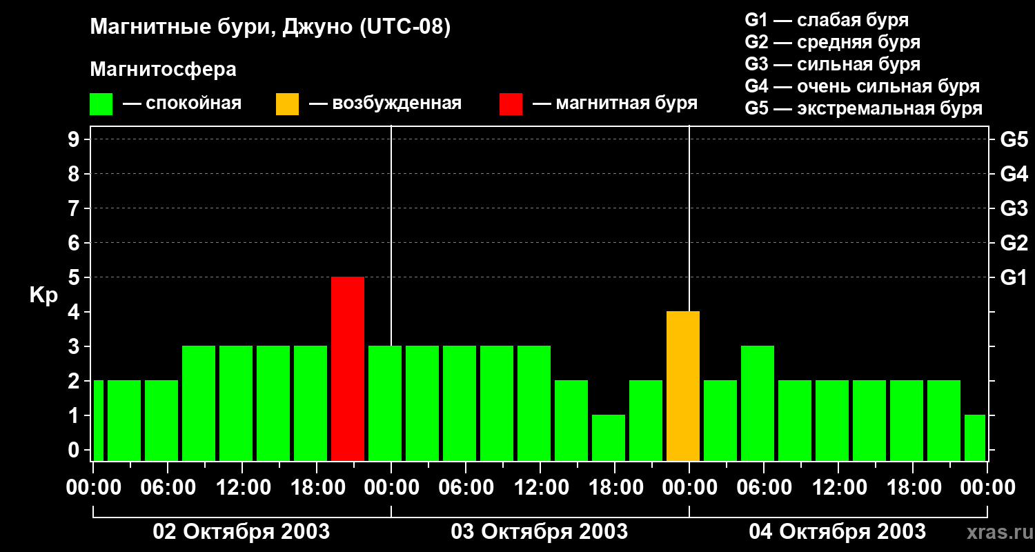 Изменения геомагнитного индекса Kp с 2 по 4 октября 2003 года для средних широт
