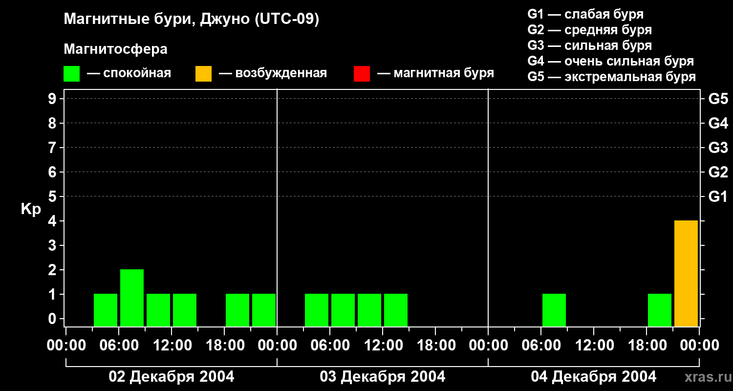 Изменения геомагнитного индекса Kp с 2 по 4 декабря 2004 года для средних широт