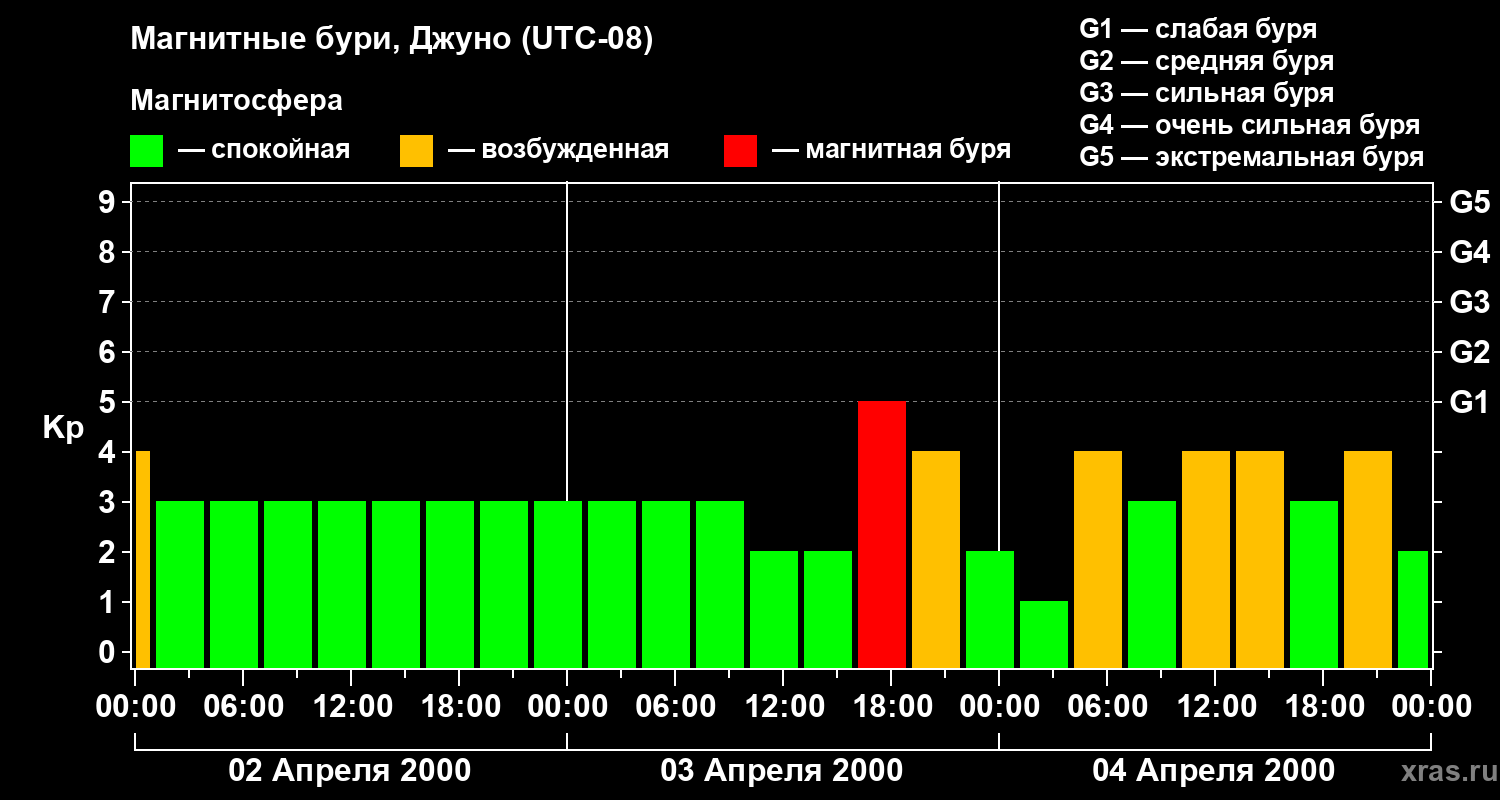 Изменения геомагнитного индекса Kp с 2 по 4 апреля 2000 года для средних широт