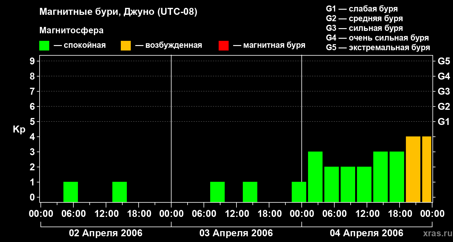 Изменения геомагнитного индекса Kp с 2 по 4 апреля 2006 года для средних широт