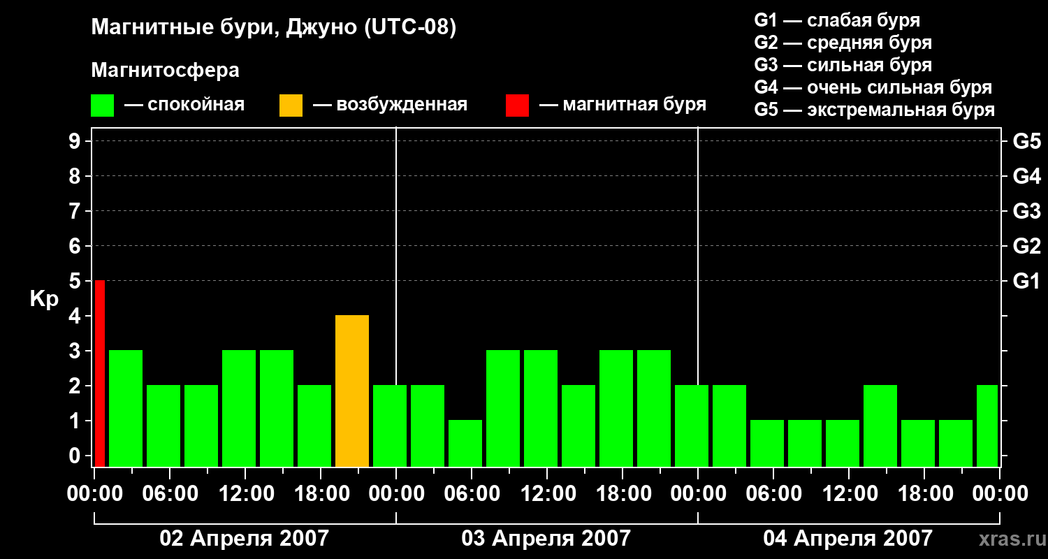 Изменения геомагнитного индекса Kp с 2 по 4 апреля 2007 года для средних широт