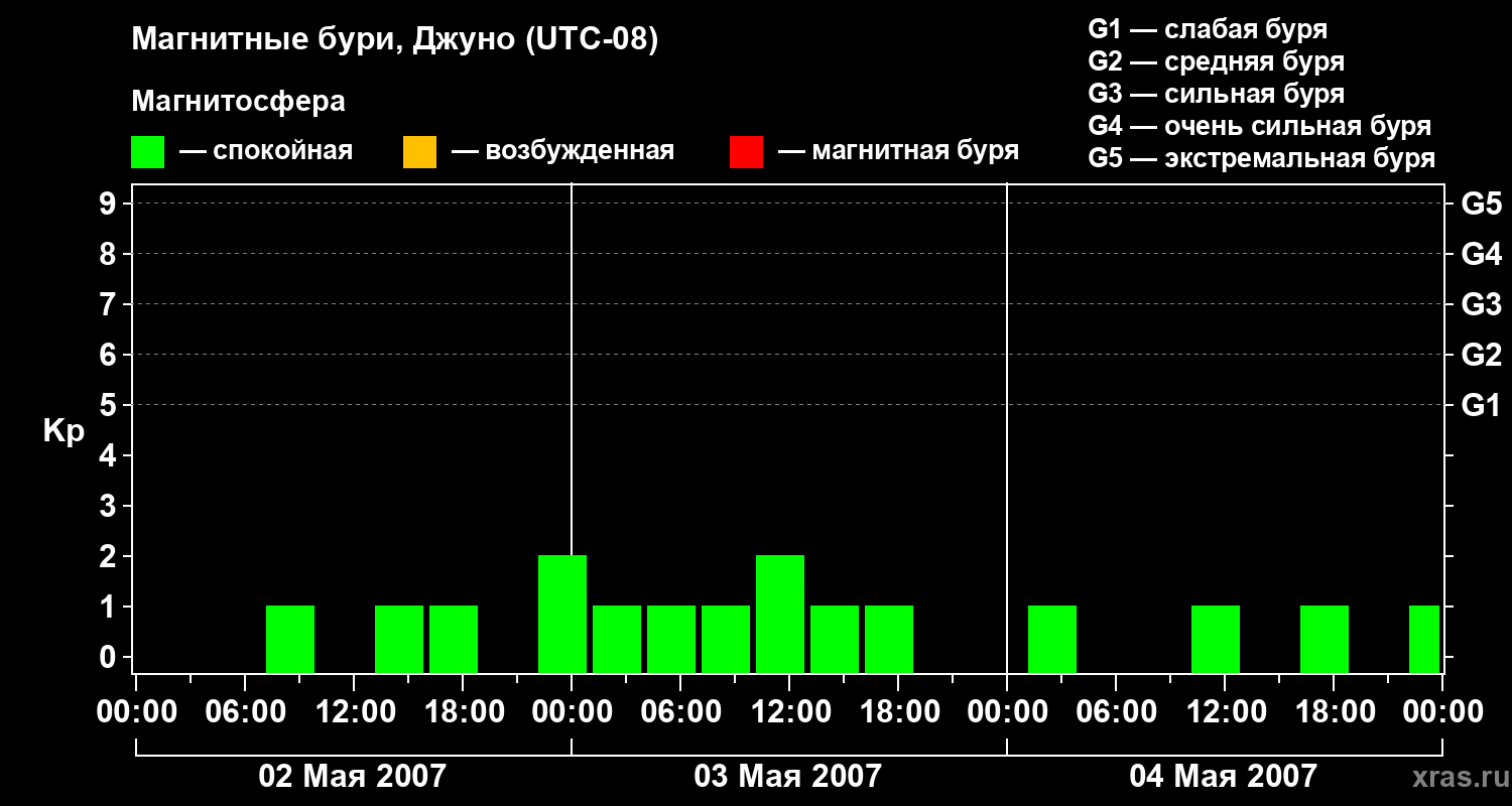 Изменения геомагнитного индекса Kp с 2 по 4 мая 2007 года для средних широт