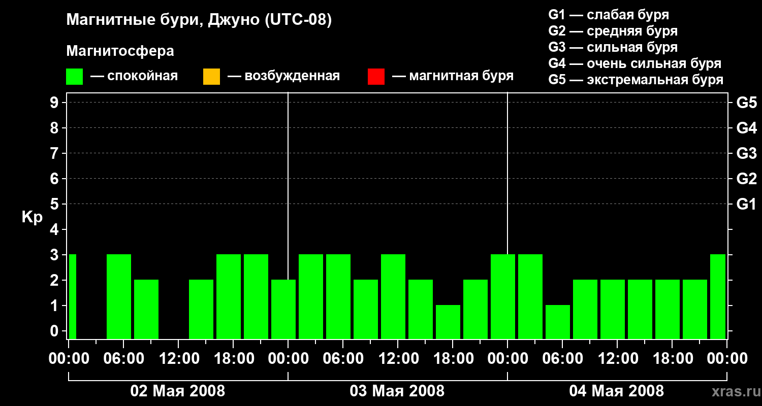 Изменения геомагнитного индекса Kp с 2 по 4 мая 2008 года для средних широт