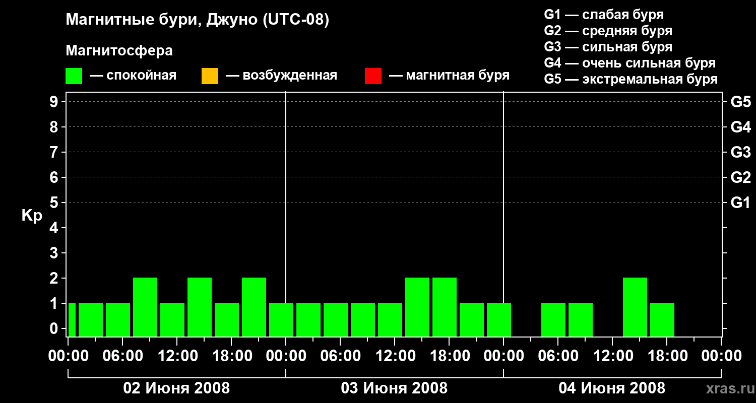 Изменения геомагнитного индекса Kp с 2 по 4 июня 2008 года для средних широт