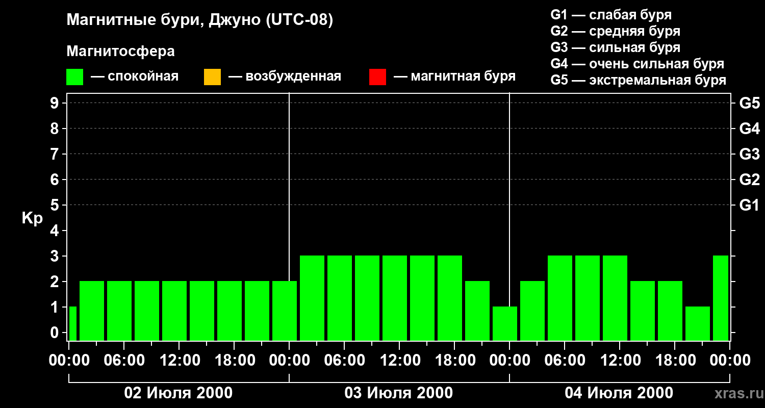 Изменения геомагнитного индекса Kp с 2 по 4 июля 2000 года для средних широт