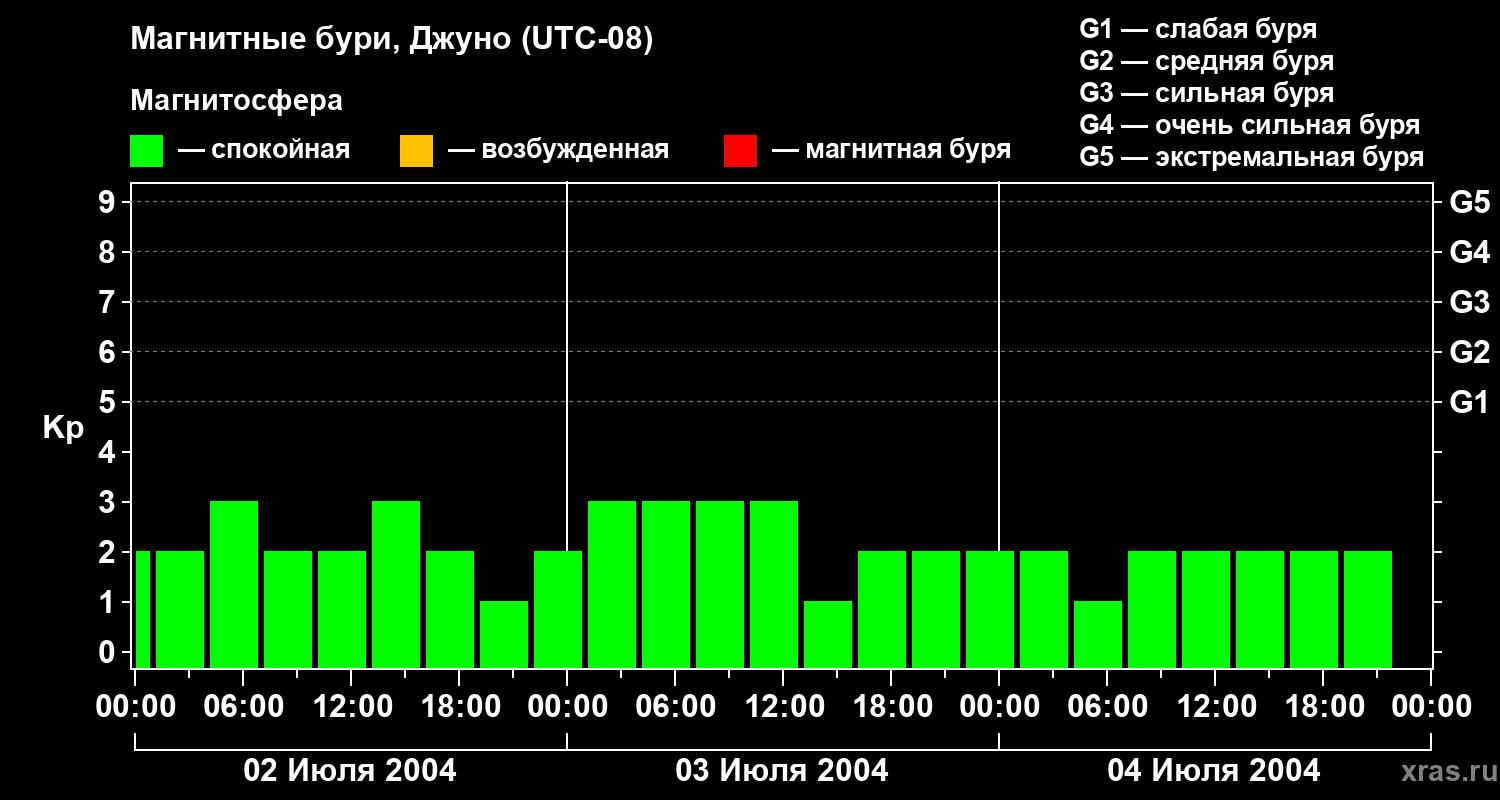 Изменения геомагнитного индекса Kp с 2 по 4 июля 2004 года для средних широт