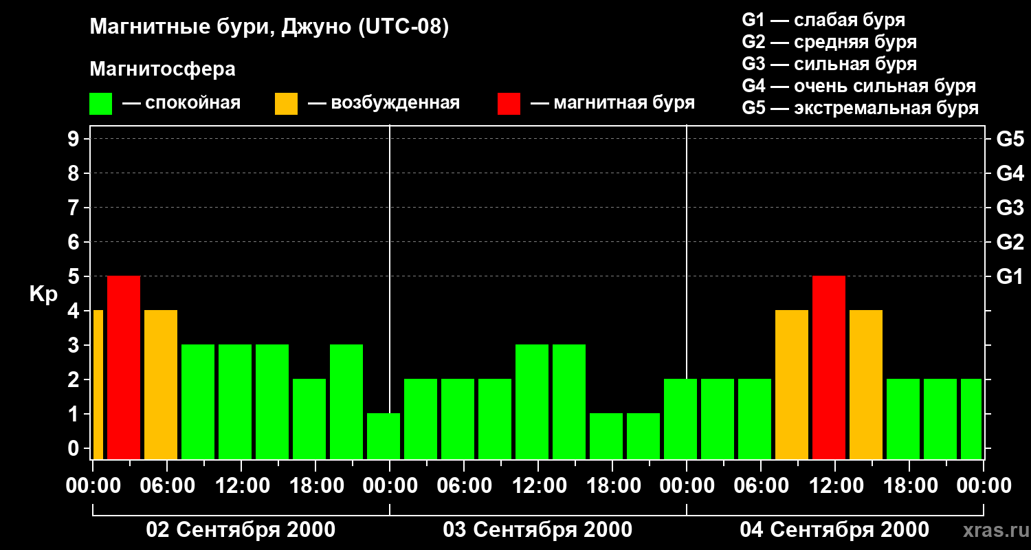 Изменения геомагнитного индекса Kp с 2 по 4 сентября 2000 года для средних широт