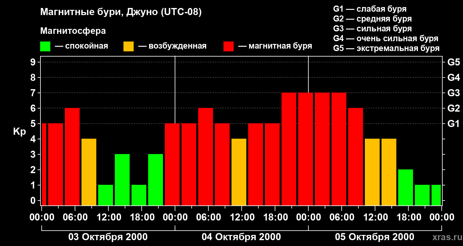 Изменения геомагнитного индекса Kp с 3 по 5 октября 2000 года для средних широт