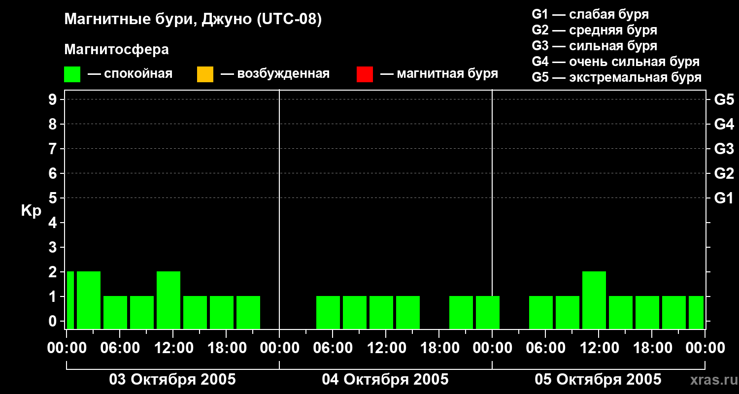 Изменения геомагнитного индекса Kp с 3 по 5 октября 2005 года для средних широт