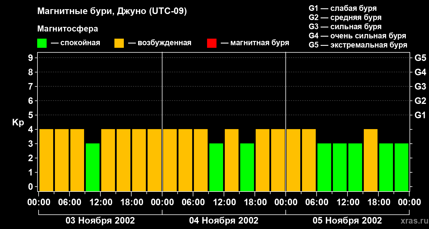 Изменения геомагнитного индекса Kp с 3 по 5 ноября 2002 года для средних широт