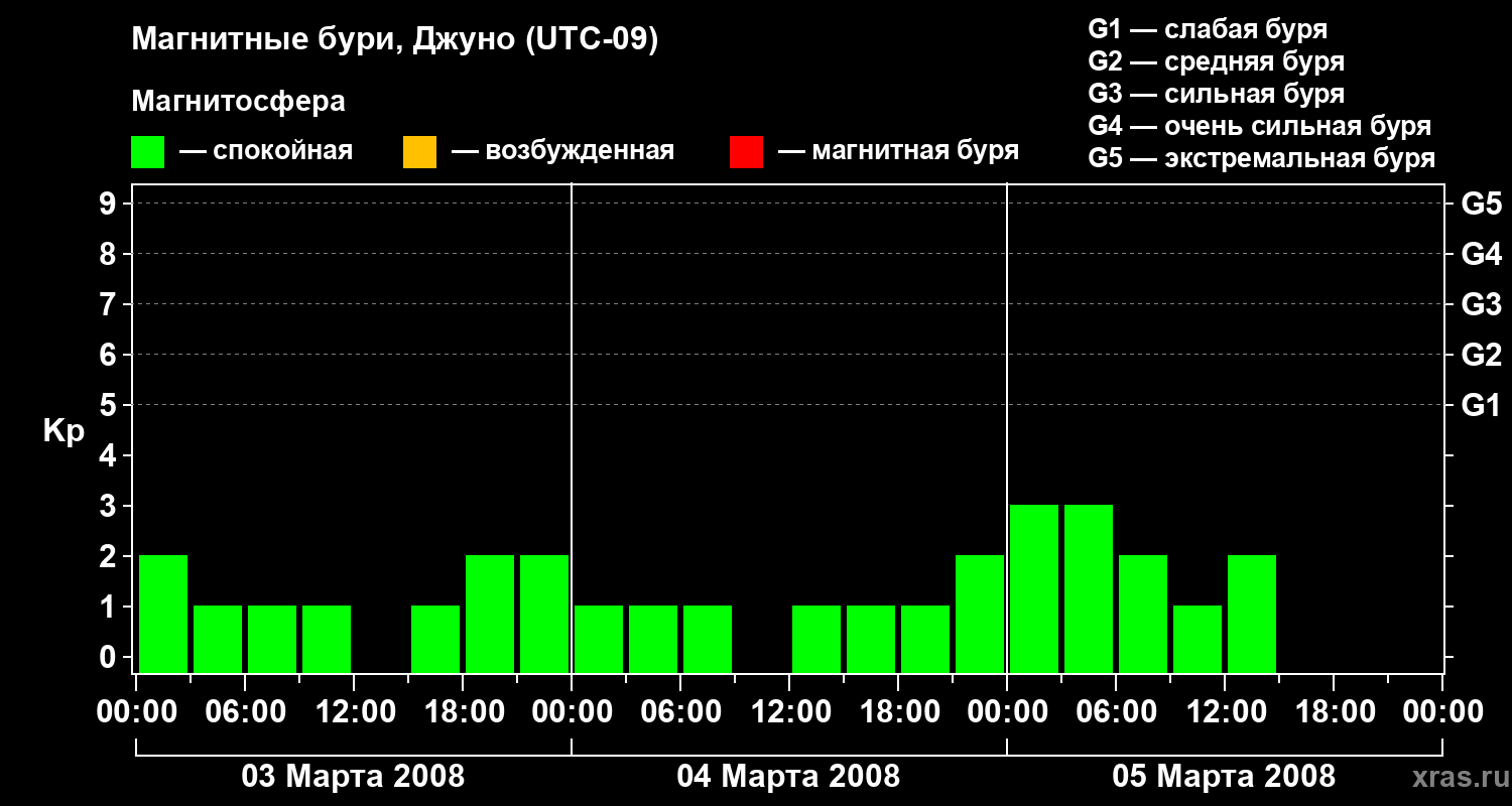 Изменения геомагнитного индекса Kp с 3 по 5 марта 2008 года для средних широт