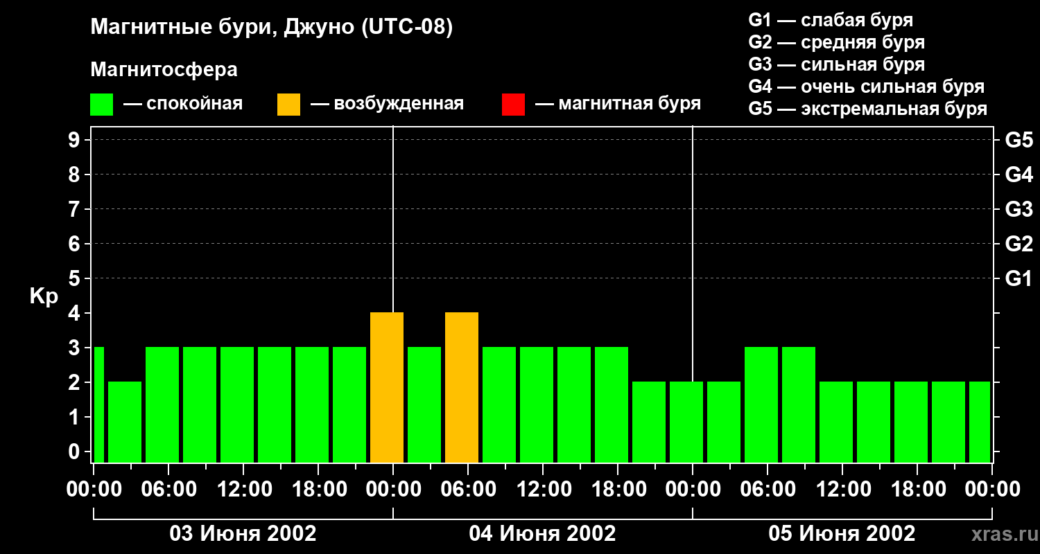 Изменения геомагнитного индекса Kp с 3 по 5 июня 2002 года для средних широт