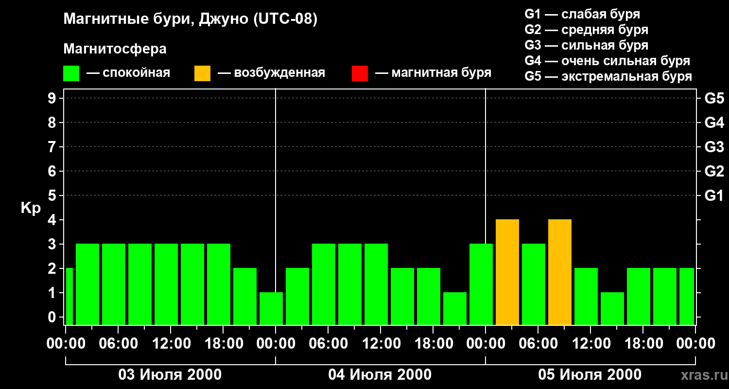 Изменения геомагнитного индекса Kp с 3 по 5 июля 2000 года для средних широт