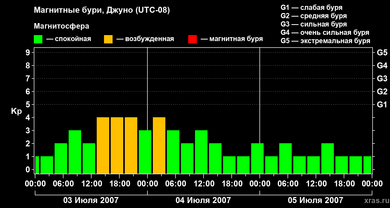 Изменения геомагнитного индекса Kp с 3 по 5 июля 2007 года для средних широт