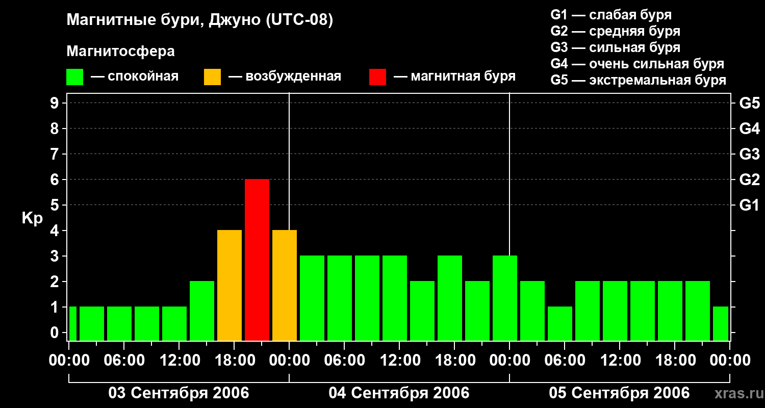 Изменения геомагнитного индекса Kp с 3 по 5 сентября 2006 года для средних широт