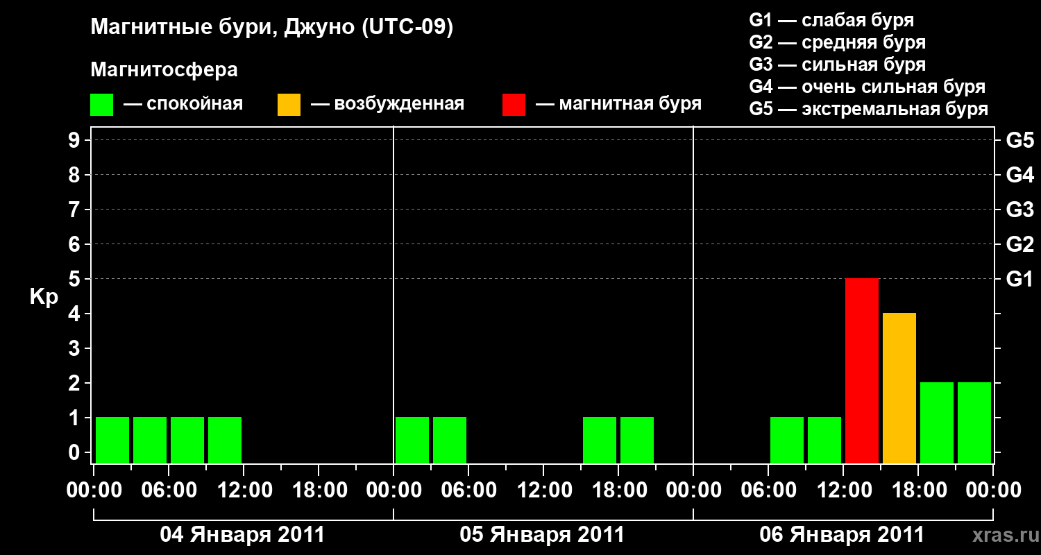 Изменения геомагнитного индекса Kp с 4 по 6 января 2011 года для средних широт