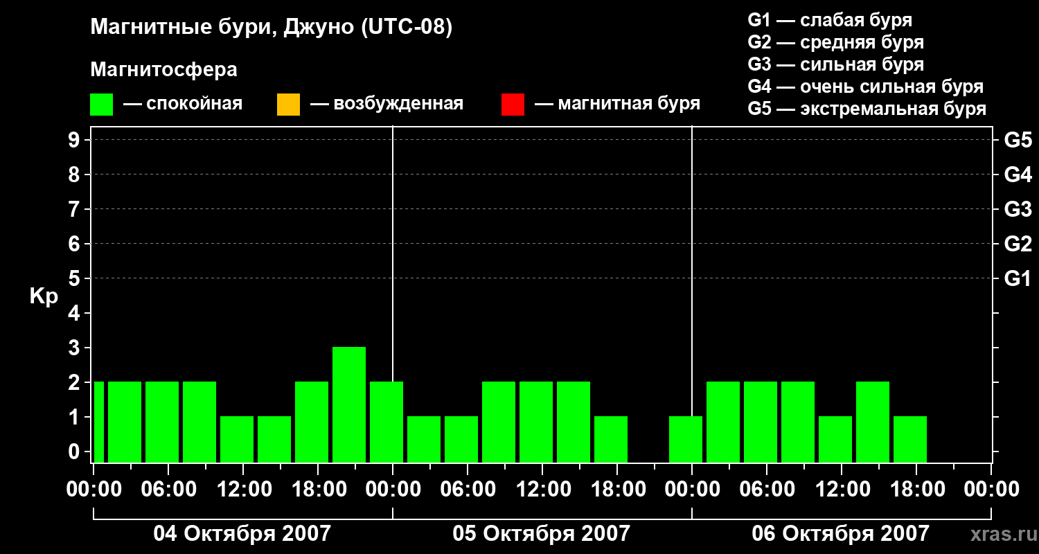 Изменения геомагнитного индекса Kp с 4 по 6 октября 2007 года для средних широт