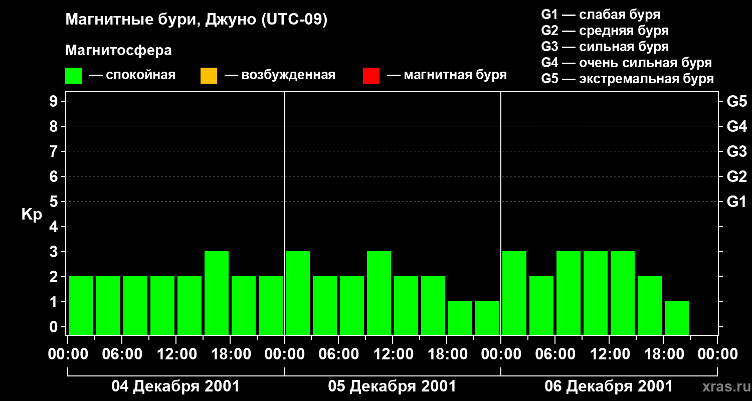 Изменения геомагнитного индекса Kp с 4 по 6 декабря 2001 года для средних широт