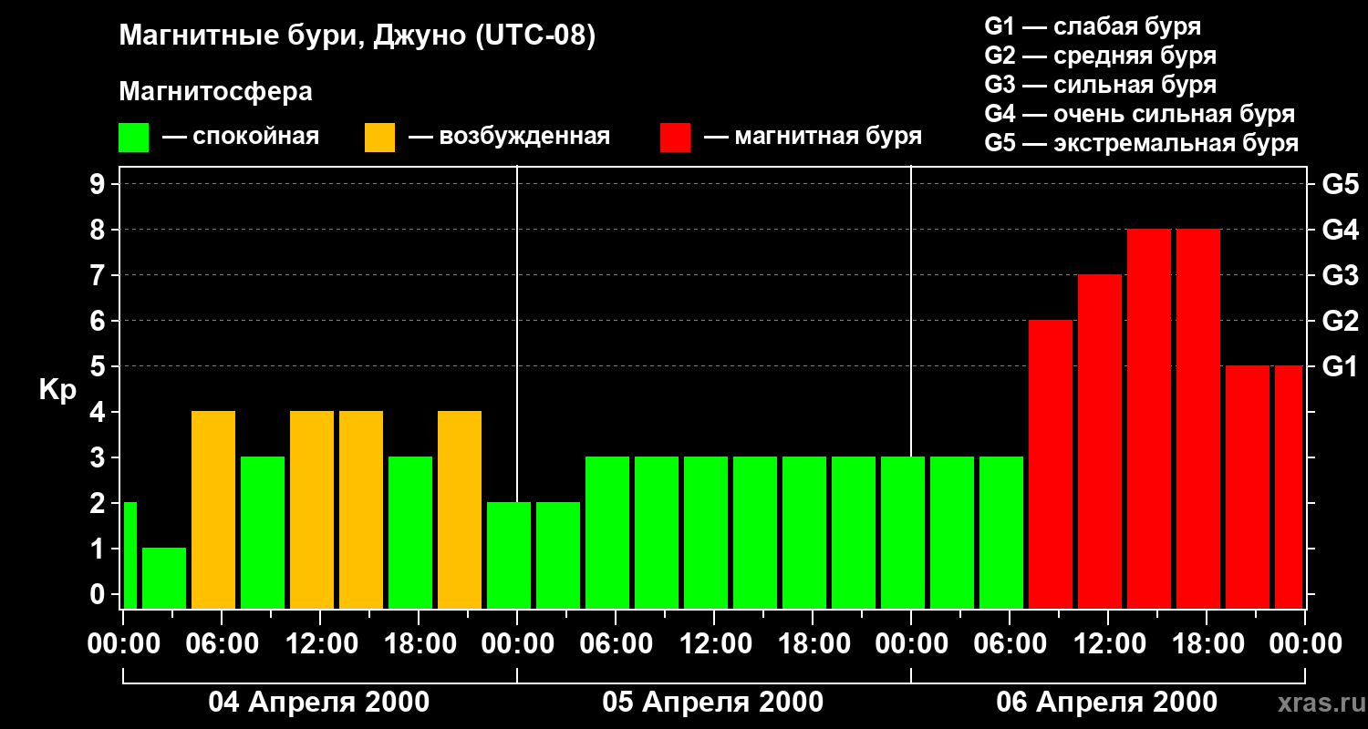 Изменения геомагнитного индекса Kp с 4 по 6 апреля 2000 года для средних широт