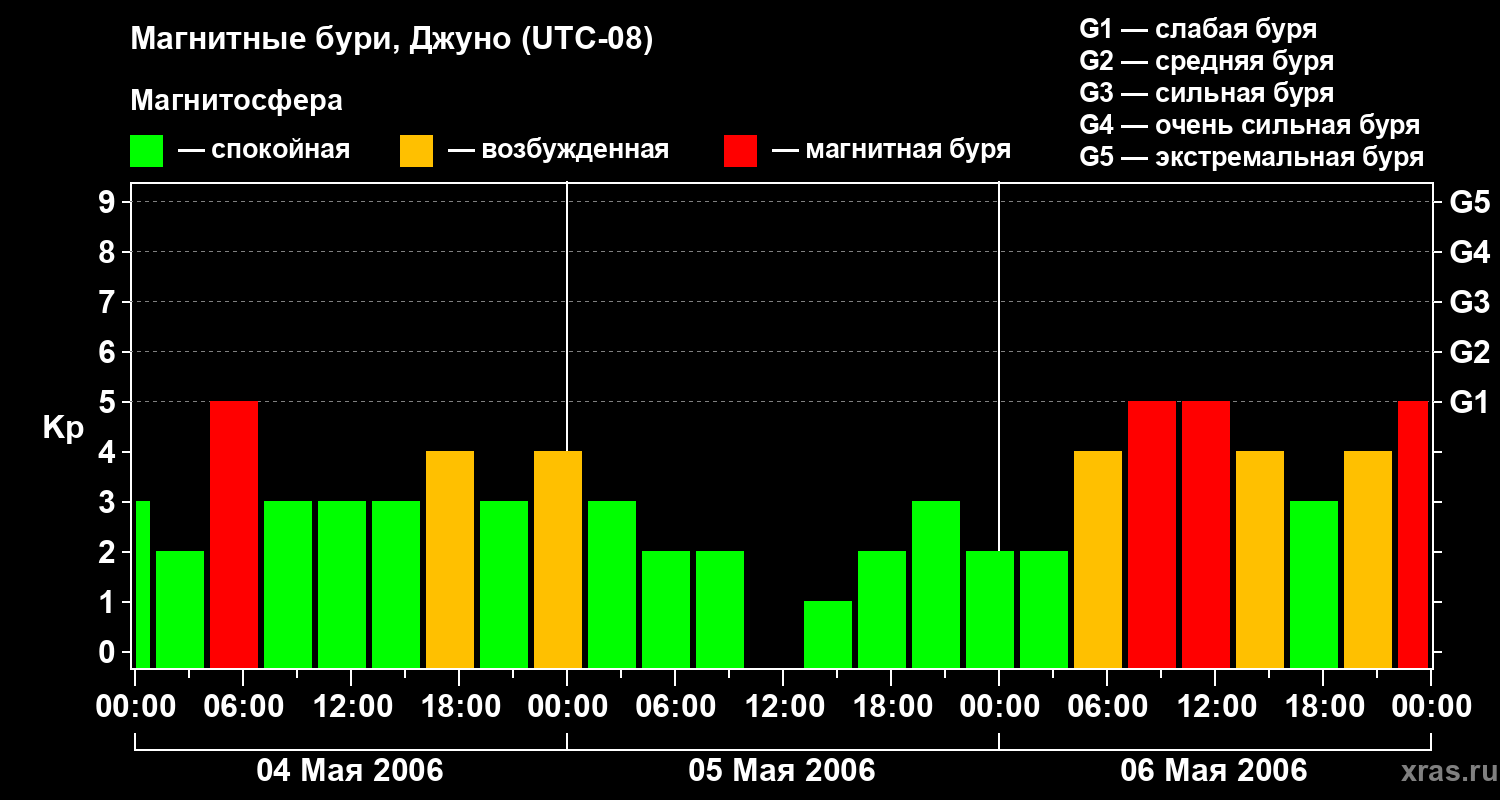 Изменения геомагнитного индекса Kp с 4 по 6 мая 2006 года для средних широт