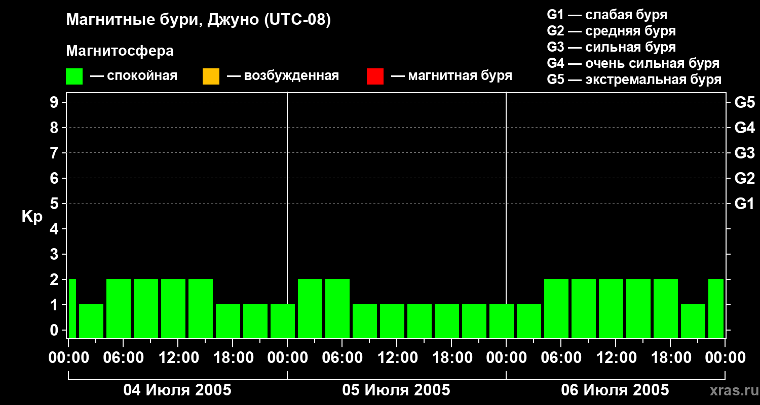 Изменения геомагнитного индекса Kp с 4 по 6 июля 2005 года для средних широт