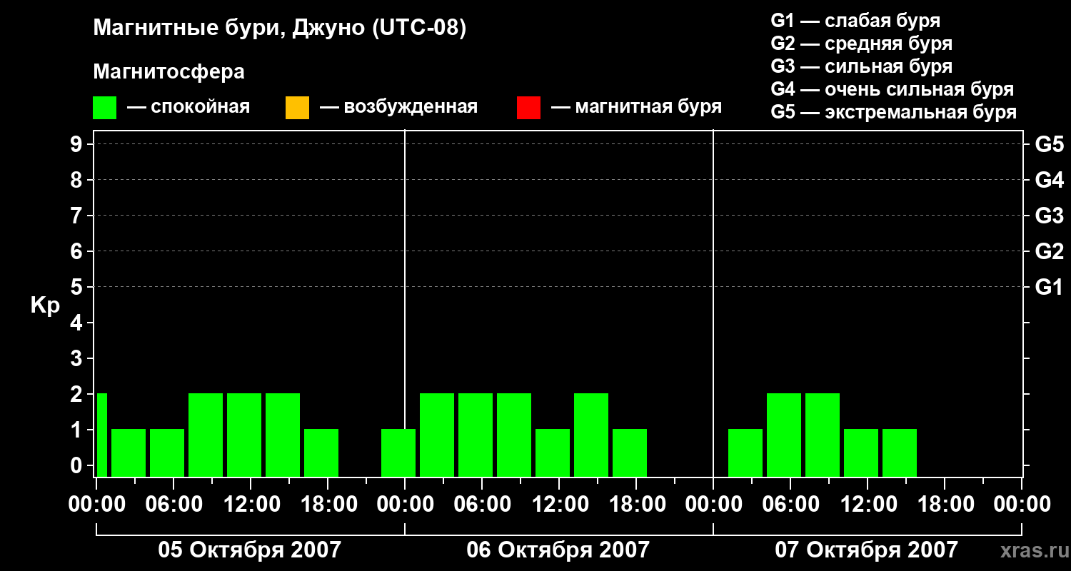 Изменения геомагнитного индекса Kp с 5 по 7 октября 2007 года для средних широт