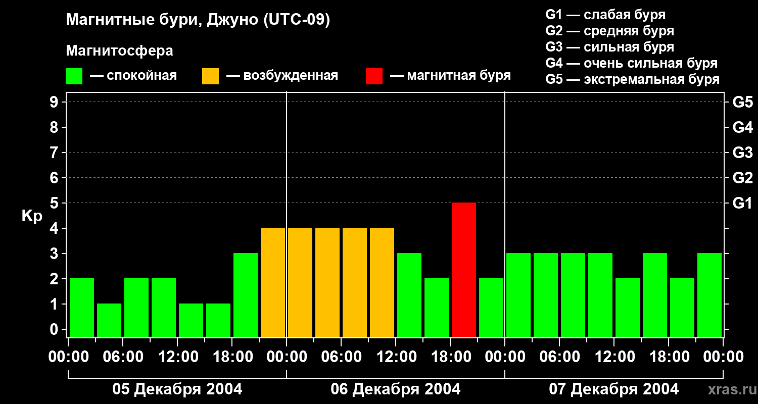 Изменения геомагнитного индекса Kp с 5 по 7 декабря 2004 года для средних широт