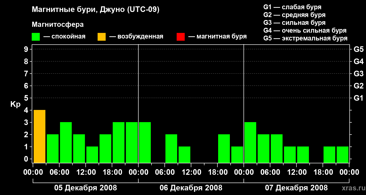 Изменения геомагнитного индекса Kp с 5 по 7 декабря 2008 года для средних широт