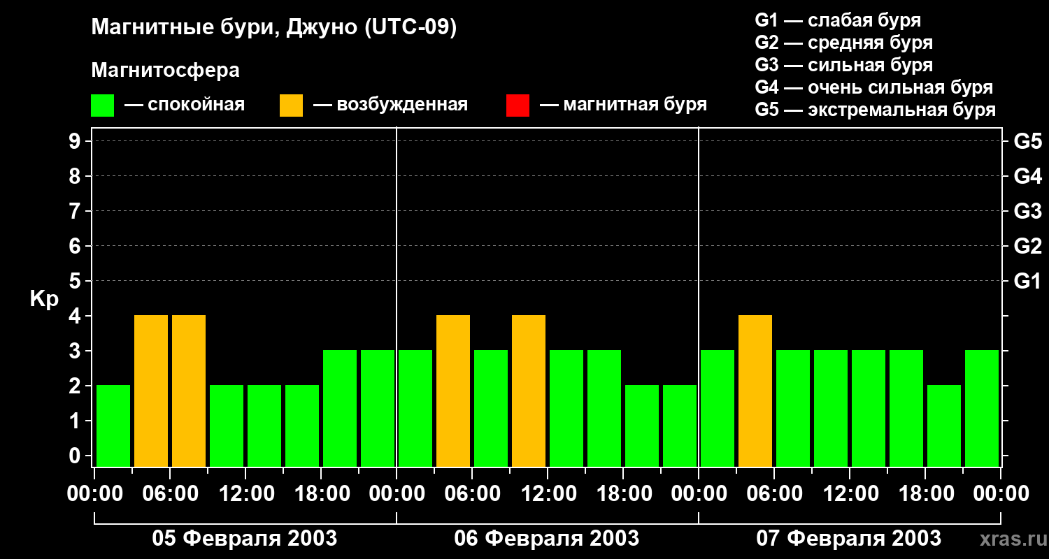 Изменения геомагнитного индекса Kp с 5 по 7 февраля 2003 года для средних широт