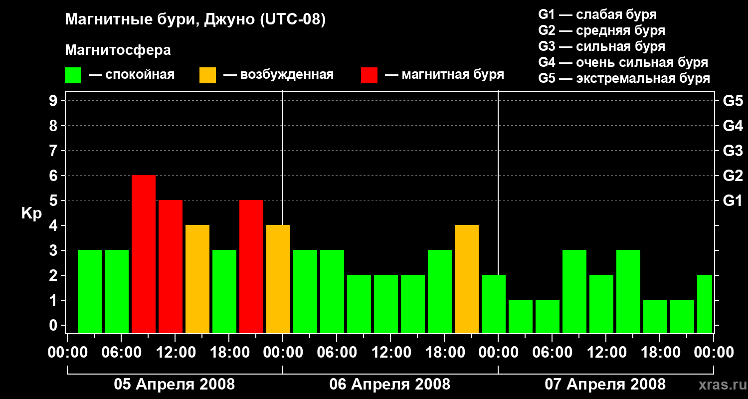 Изменения геомагнитного индекса Kp с 5 по 7 апреля 2008 года для средних широт