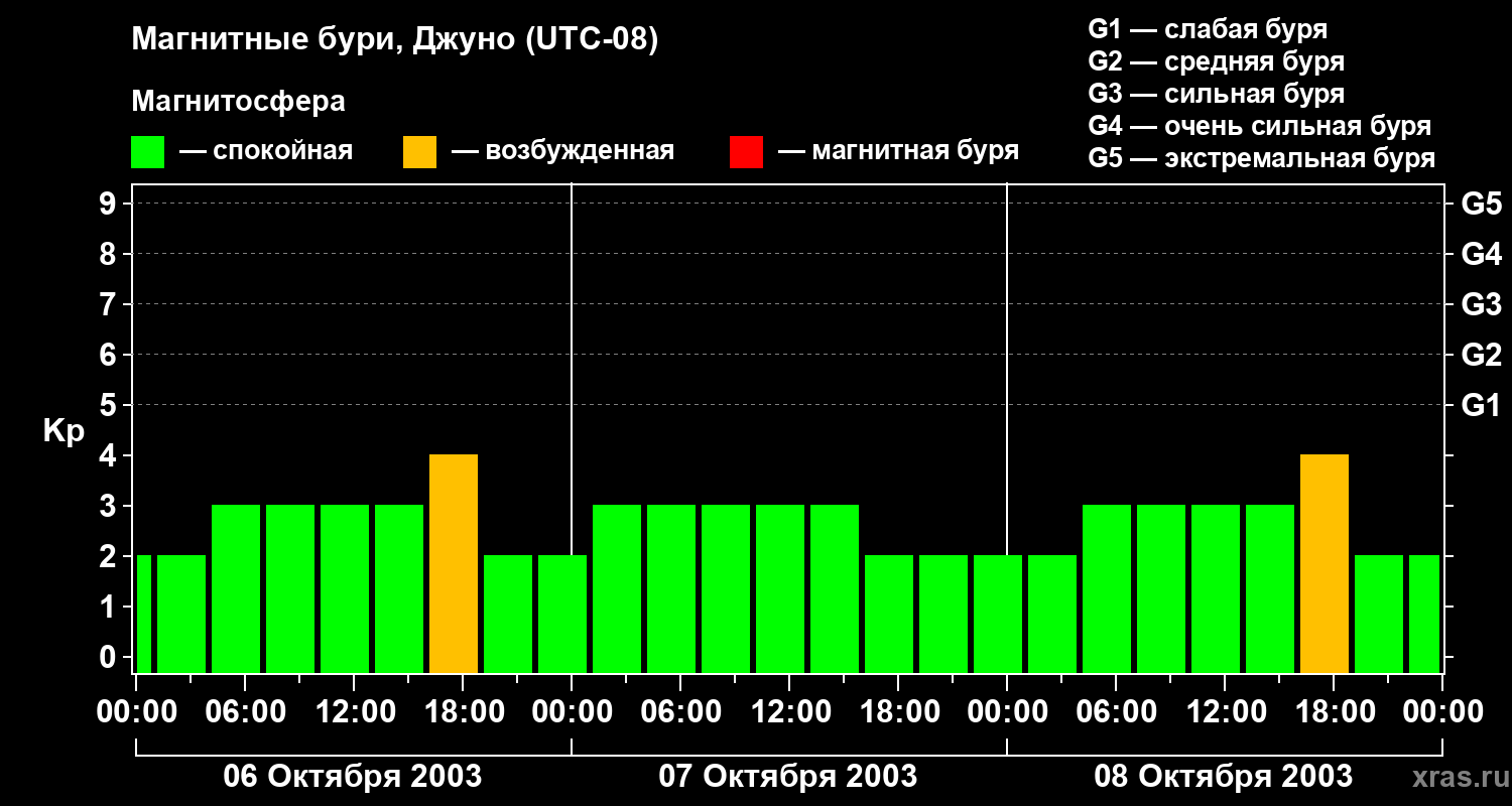 Изменения геомагнитного индекса Kp с 6 по 8 октября 2003 года для средних широт