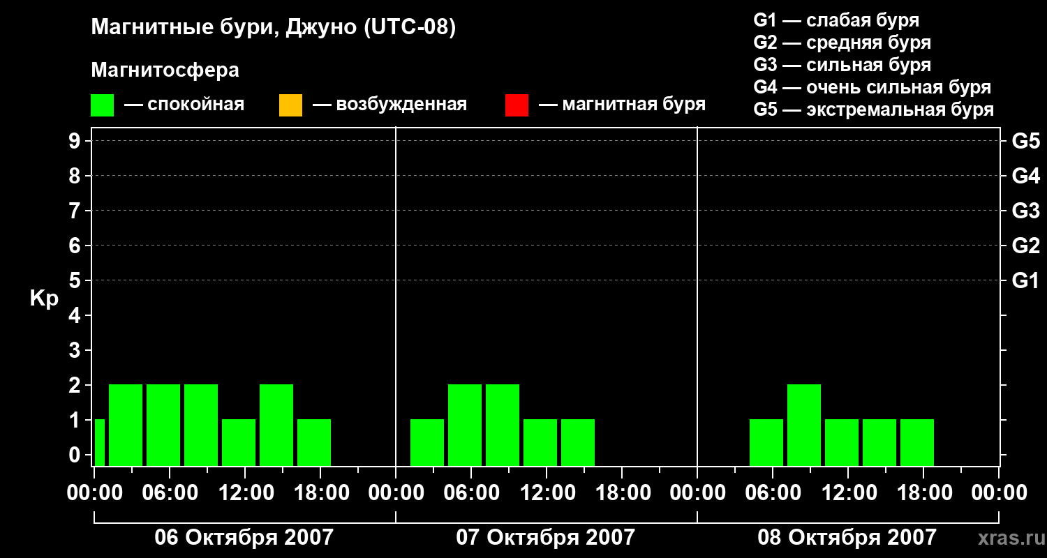 Изменения геомагнитного индекса Kp с 6 по 8 октября 2007 года для средних широт
